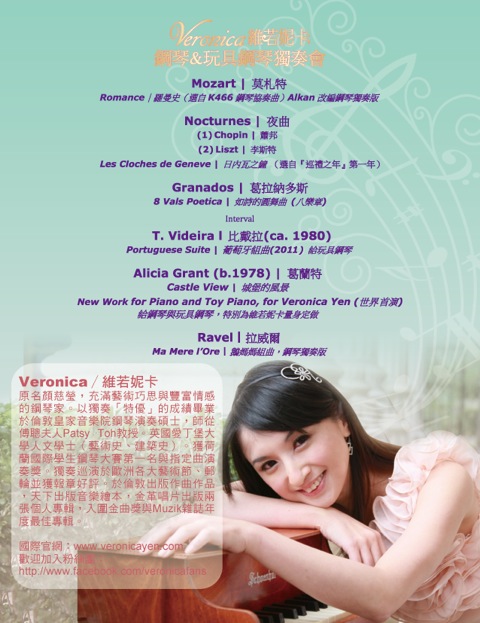 Miss Veronica Yen played it in Taiwan in a concert 3 March 2012, and in another on April 15, 2012. You can watch an excerpt of her playing the second movement “The sewing machine”.